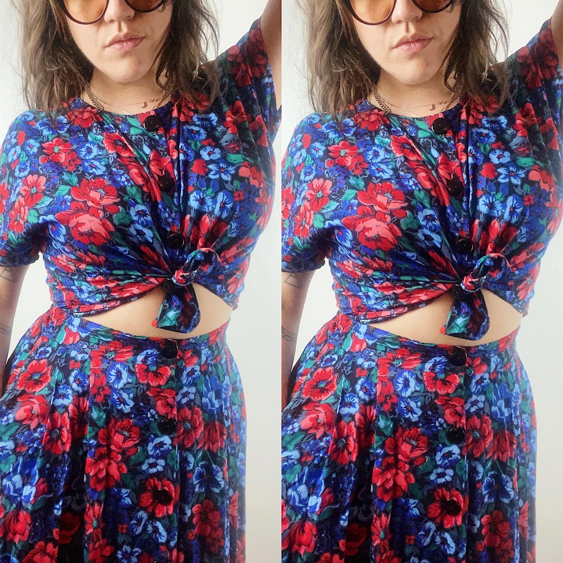 80s perfect floral gem-tone two piece set. Soft rayon material. Buttons up the front of the top and skirt. The skirt has a little stretch in the back. Wear together or separately, whatever floats your boat. Size 8/10